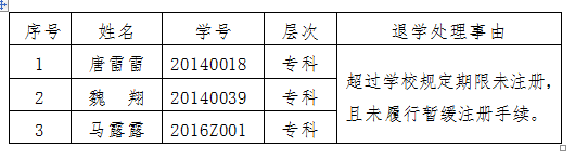 根据万象城体育awcsportallwincity万象城《关于成人高等教育学生学籍管理规定(修订)》第九条、三十一条相关规定,经学校研究决定,给予唐雷雷等3名学生退学处理。具体名单及处理事由如下: